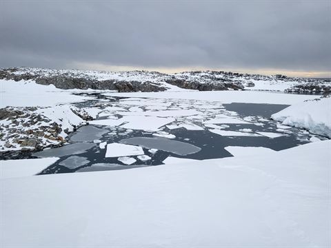 From the rec isle, we walked up the hill and went behind the last building. Anything past this last building is considered the backyard. This area is surrounded by two sections of water and the landscape is rock with multiple dips and valleys. During this hike, it was all covered in snow.