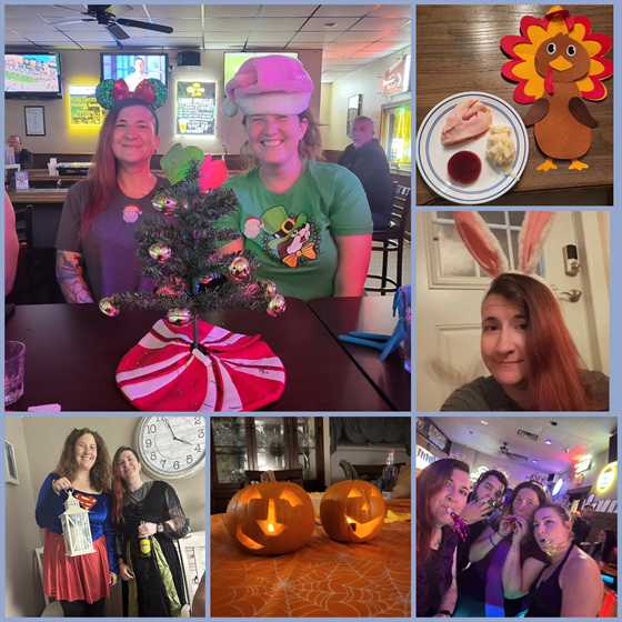 The following day, we celebrated Thanksgiving with turkey themed crafts, a make shift thanksgiving meal and the homemade apple pie. Then with a little planning, we got our derby team to celebrate Christmas with a white elephant after a Monday night practice. We even set up a little tree at the bar and everything! It came out super cute and even brought a few smiles to the other random patrons at the bar. We also crammed in Saint Patrick’s day and Valentines day that night too – everyone received a little Valentines day card from me, candy included of course!